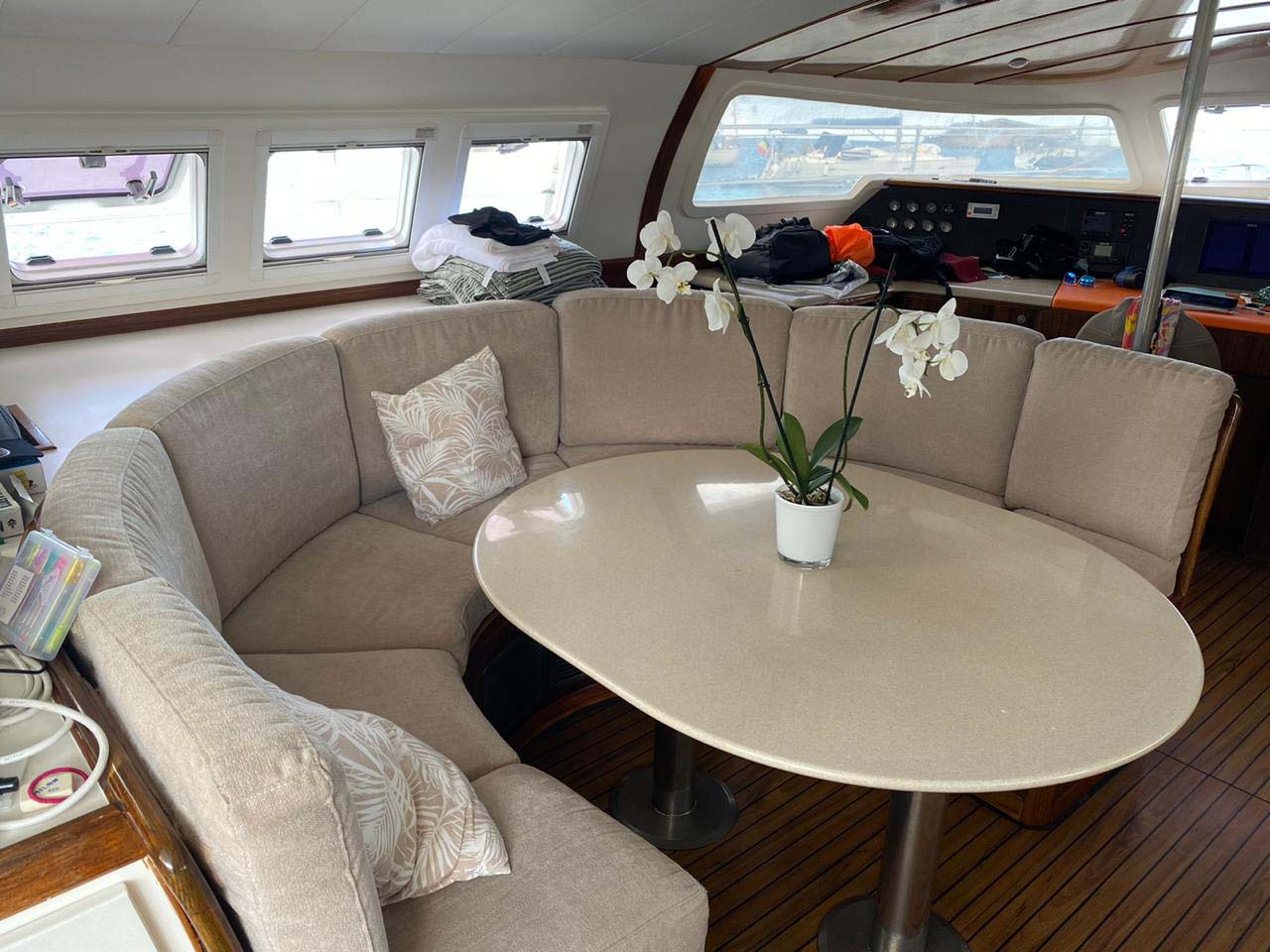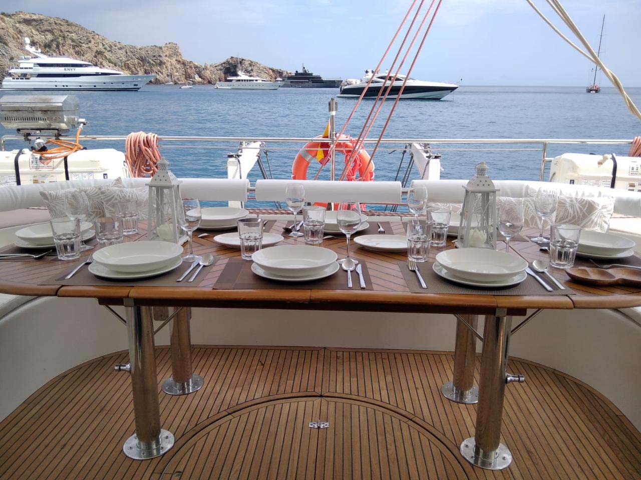 From the aft cockpit with a large table and bench around it invites us to enjoy breakfast, lunch or dinner while contemplating the sea and the horizon.
